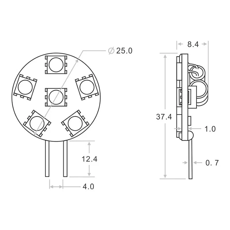 Товар: светодиодный G41 Вт Светодиодная лампа высокой мощности, 6 шт 5050 SMD, светодиодный ная сменная лампа, 6400k дневсветильник белый с фитингом G4, подходит для стандарта GU53/ MR16 / MR11. 2-контактный, яркость 120-132 лм, эквивалентная галогену 10-15 Вт. Также можно использовать в домах для замены галогенных ламп на 12 В, оптимально использовать с источником постоянного тока.Длительный срок службы: Белый светодиодный До 50000 + часов (5,7 + лет), Сэкономьте на счетах за питание, заменив этиПрименениеСолнечные энергетические системы, ветрогенератор, гидрогенераторИспользуйте дома при правильном напряжении постоянного токаНебольшие домашние проекты.Научные проекты.Электронные приложения.RV, яхты, лодки, корабли, автомобили, тележкиУкажитеМодель: G4-6-25AИсточник светильник: 6 шт 5050 SMDНапряжение: 12 В постоянного тока/12 В переменного токаРазмеры: диаметр 25 мм, штифт 14 ммУгол свечения: 180 °Тип цоколя: G4Освещение:-лмПотребляемая мощность: 1 ВтДиммируемый, диммерЦвет: белый, теплый белый, холодный белыйВозможность биполярности
