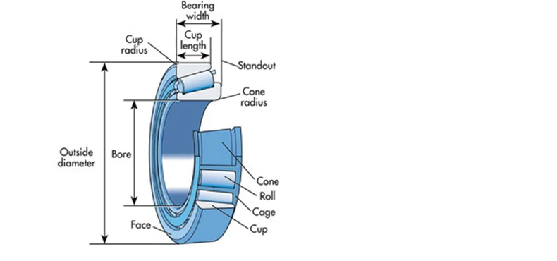 Конические роликовые подшипники состоят из внешнего кольца, внутреннего кольца, роликов и клетки. Этот подшипник содержит конические ролики для своего прокатного элемента, которым руководствуется ребро обратной стороны внутреннего кольца на большой торцевой поверхности ролика. Поверхности качения внутреннего кольца и внешнего кольца и контактная поверхность роликов качения спроектированы так, что соответствующие apexes сходятся в точке на центральной линии подшипника. Подшипники классифицируются по стандарту, Промежуточные и крутые типы, в соответствии с их углом соприкосновения (α). Чем больше угол соприкосновения, тем больше сопротивление подшипника осевой нагрузке.