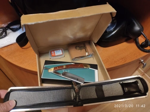 Бритва хорошо обработана. Так что я не мог избежать дефектов. Нож кажется острым, но после первого бритья только покажет. Подвешивающий кожаный ремень также покрыт, в который также входит тканевый ремешок. Паста для жирной кожи, чтобы она не была мягкой.
