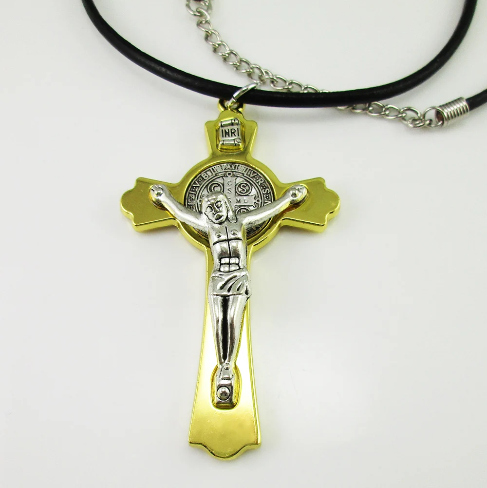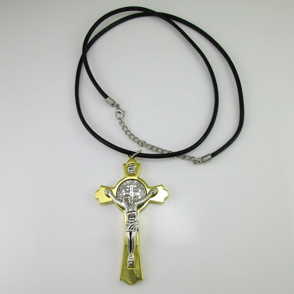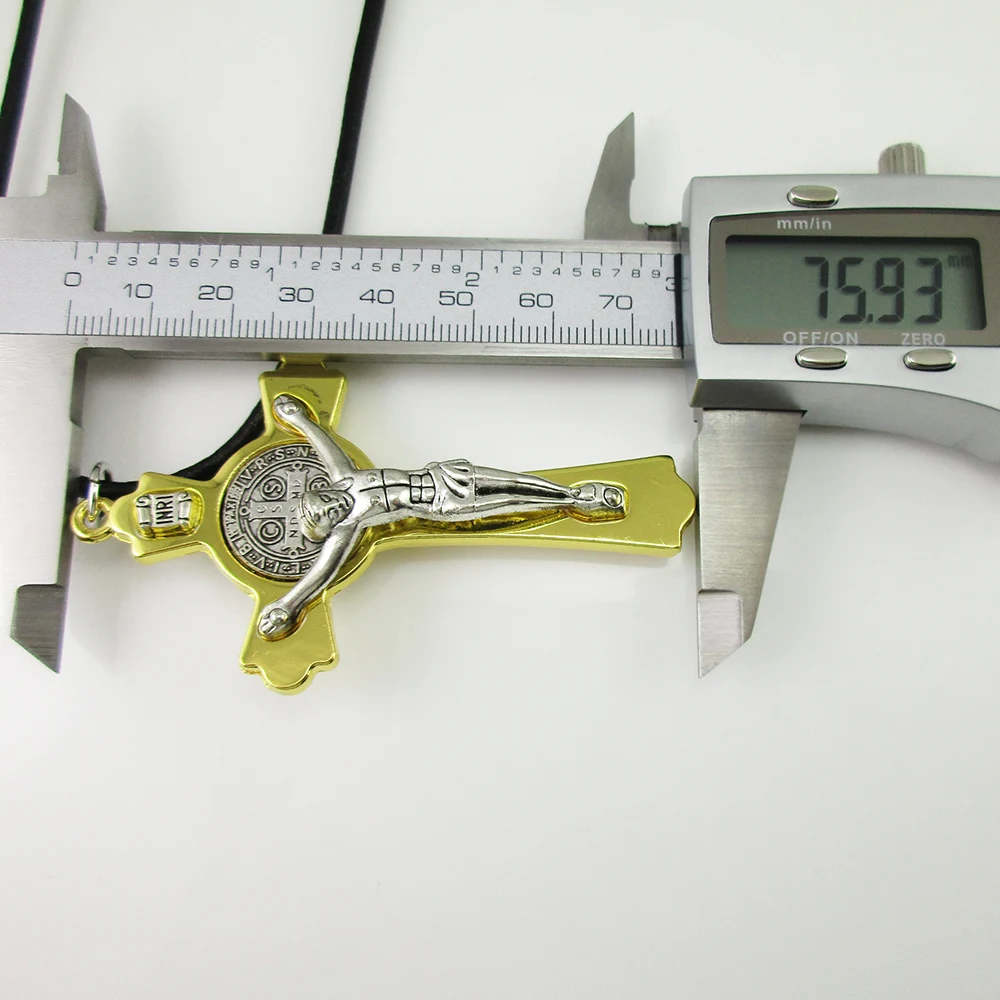 12 шт. распятия Святого Бенедикта с кожаным ожерельем, надписью и поливиниловым чехлом