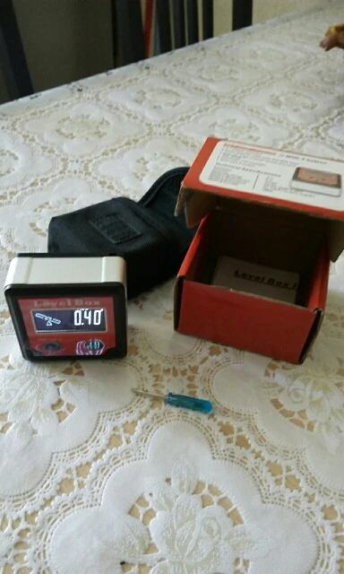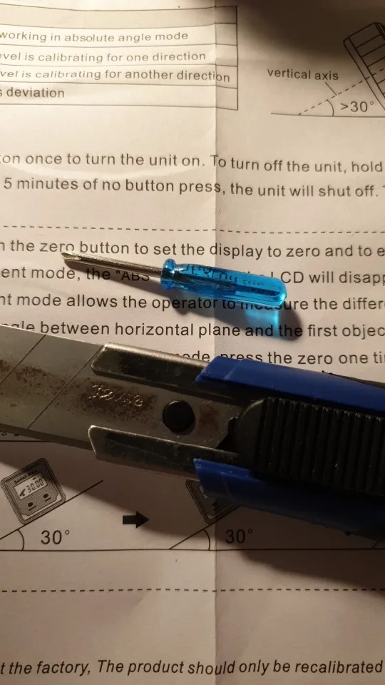 Очень понравился уровень. Два режима: абсолютный и относительный. Разряд точности достаточно высокий, так что даже непривычно видеть в пять сотых или одну десятую градуса. Кстати в инструкции написано, что при длительном хранении нужно извлекать батарейки, поэтому и лежит отвертка в комплекте. Хотя это не очень удобно.