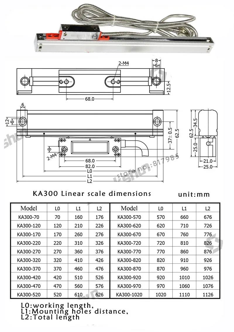 1. Длина перемещения (измерения): 0-520 мм 2. Разъем: DB9 3. Разрешение: 0,005 мм (5 мкм) 4. Входное напряжение: 5 В постоянного тока 5. Шаг решетки: 0,02 мм (50LP/мин) 6. Длина кабеля: 3 метра 7. Размер: 18*20 мм 8. KA-500-это своего рода тонкая шкала, ширина в использовании на токарном станке, мини-машинах, которые имеют очень небольшое пространство для установки.