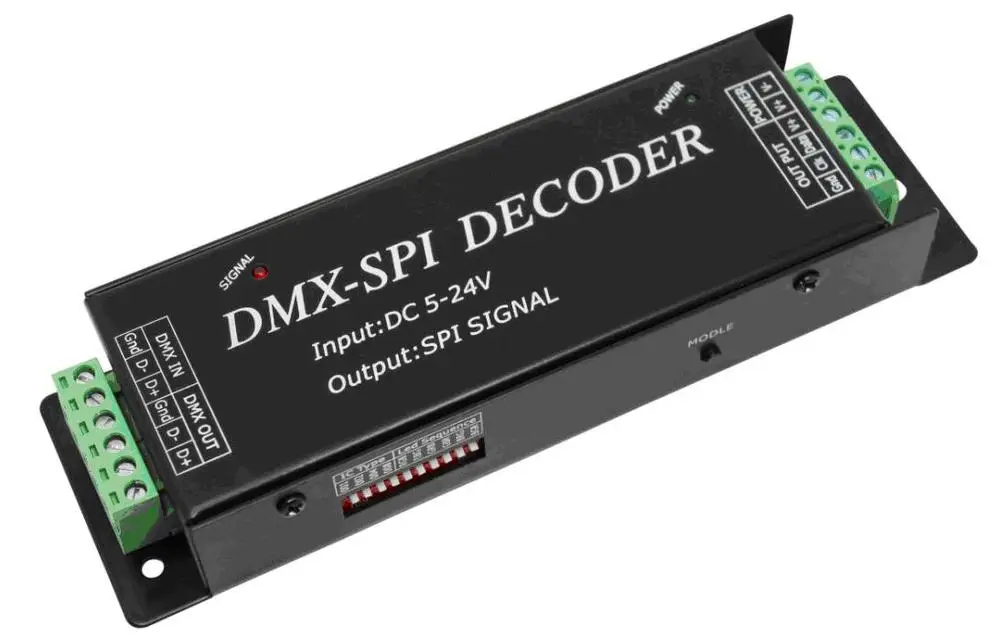 DMX-SPI декодирует усовершенствованный блок микроуправления, он получает Стандартный DMX-512 цифровой контрольный сигнал, который широко используется на международном уровне и преобразует его в сигнал SPI для привода светодиодный, он поддерживает 10 видов различных моделей ламп, в то же время порт сигнала DMX имеет меры защиты от молнии; Вы можете подключить декодер DMX к цифровой консоли DMX для достижения затемнения или различных изменений процедур. Не подключен к консоли DMX, вы можете выбрать встроенный 35 видов узоров по умолчанию с помощью кнопки modle, точки по умолчанию-1024.