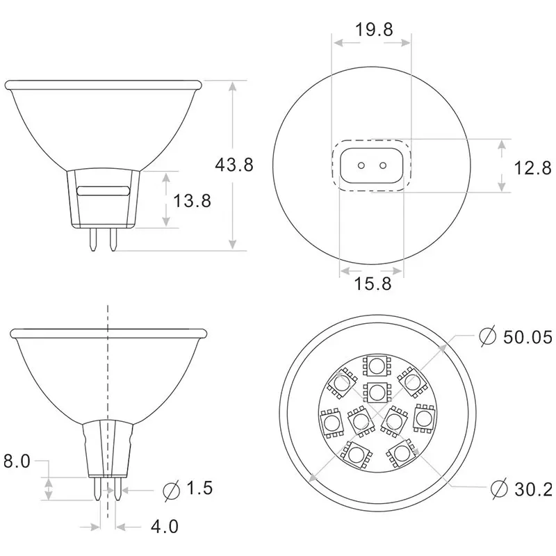 2 Вт MR16(GU5.6,GX5.6) высокомощный Светодиодный точечный светильник, светильник, 10 шт. 5050 SMD ,Bi-Pin,153-175LM яркость, эквивалентная 15 Вт-20 Вт галогену. Они являются прямой заменой для MR16 или вертикального (задний штырь) g4. Рабочий vlot DC12V, оптимальное использование с драйвером питания постоянного тока. Применение Ландшафтная сцена/точечное освещение Архитектурное освещение Демонстрационная сцена Художественное освещение Освещение настроения/общее освещение Место для парка развлечений Укажите Источник света 10 шт 5060 SMD Напряжение: AC/DC10-30V Люмены: 153-175LM, яркость эквивалентна галогену 15 Вт-20 Вт Размеры: диаметр. 50 мм x h38мм, дополнительный штифт: 8 мм Угол луча: 160 ° Тип основания: MR16 Потребляемая мощность: 2 Вт Диммируемый, диммер для поверхностного монтажа Цвет: красный, желтый, зеленый, синий, чисто белый, теплый белый Двухполярность