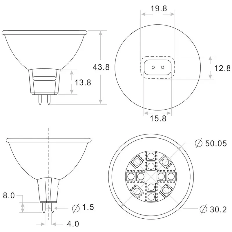 2,4 Вт MR16(GU5.6,GX5.6) высокомощсветодиодный светодиодная прожсветильник светильник ная лампа, 12 шт. 5050 SMD ,Bi-Pin,195-лм, яркость эквивалентна галогену 20-25 Вт. Они являются прямой заменой MR16 или вертикальным (обратный контакт) g4. Рабочее напряжение 12 В, 24 В, оптимальное использование с драйвером питания. Применение Ландшафтная сцена/точечное освещение Архитектурное освещение Сцена дисплея Художественное освещение Освещение настроения/общее освещение Сцена парка развлечений Укажите Источник светильник 12 шт. 5060 SMD Напряжение: 12 В 24 в 10-30 в Люмен: 195-210 лм, яркость эквивалентна галогену 20-25 Вт Размеры: диаметр 50 мм x в38 мм, дополнительный штифт: 8 мм Угол свечения: 160 ° Тип цоколя: MR16 Потребляемая мощность: 2,4 Вт Диммируемый, диммер Цвет: красный, желтый, зеленый, синий, чистый белый, теплый белый Возможность биполярности