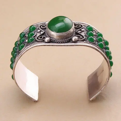 Браслет-манжета из древнего тибетского серебра с резным цветком и кружевом, с зелеными бусинами, регулируемый, подарок для вечеринки