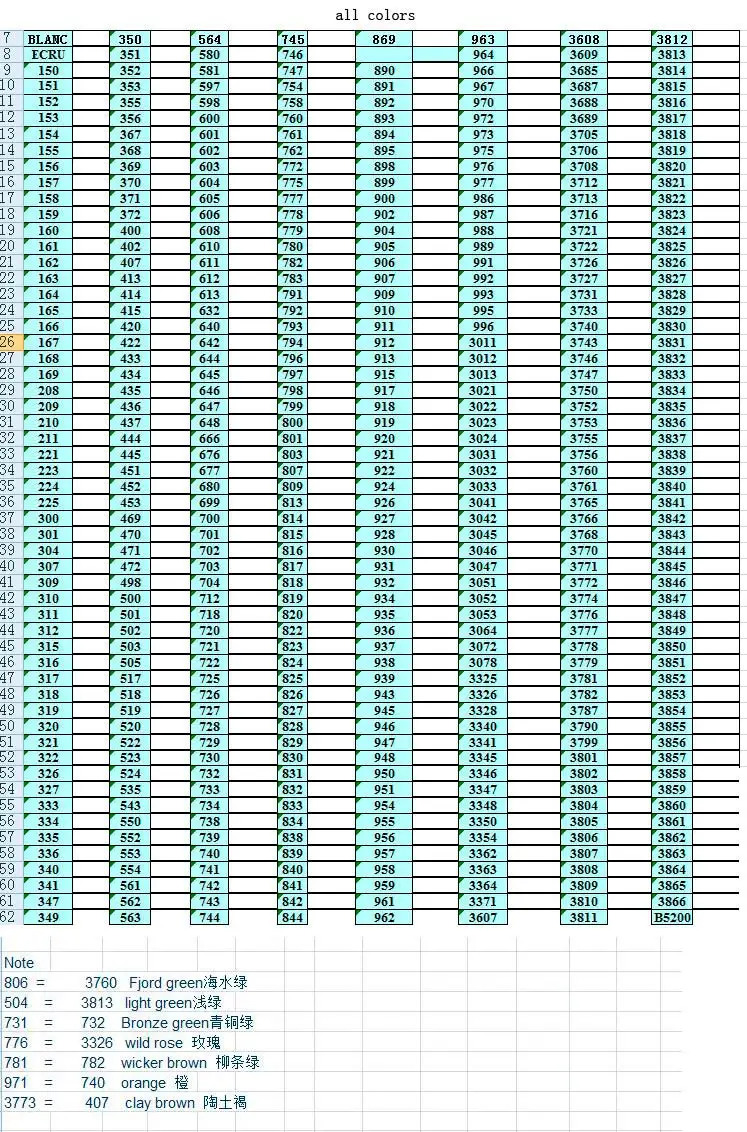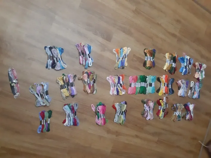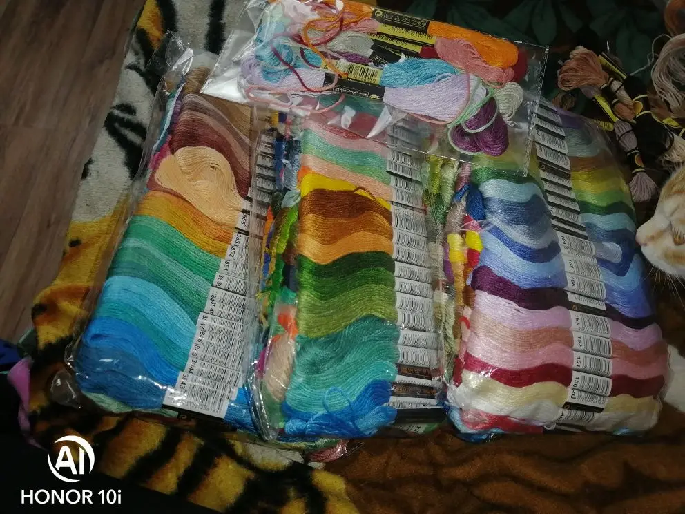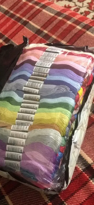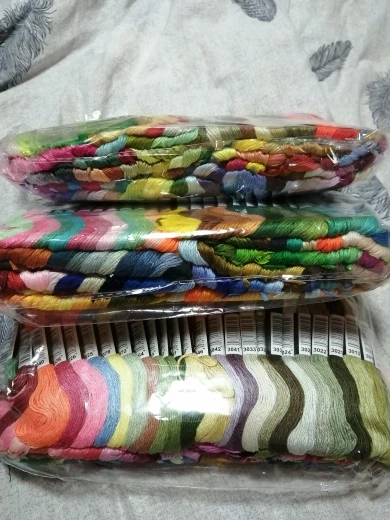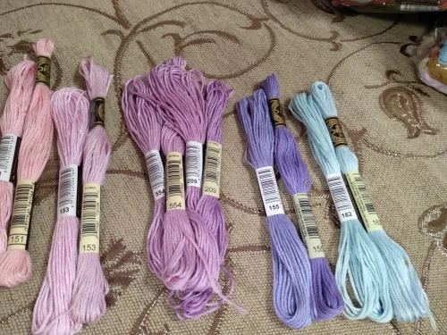 Заказала полный набор. Пришли очень быстро, менее чем за 2 недели, новой почтой. Маркировка номера точно как у ДМС. Если цвет, то совпадает. Но оттенки все ж таки не те. На фото это не так заметно, а вживую вот например 153 тут в поросячий розовый идёт, а в ДМС он в сирень приглушенную смахивает. Разница невелика, но есть. Потом состав. Тоже чуточку другой, чем у оригинала. На линьку не проверяла, тут читала отзывы что вроде нормально. Нельзя начать работу оригинальными и заканчивать этими. А если изначально китайскими вышивать, то думаю нормально будет.
