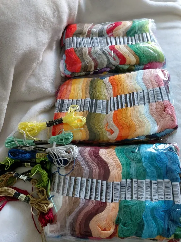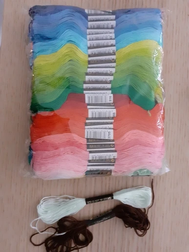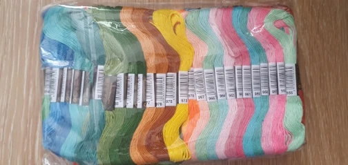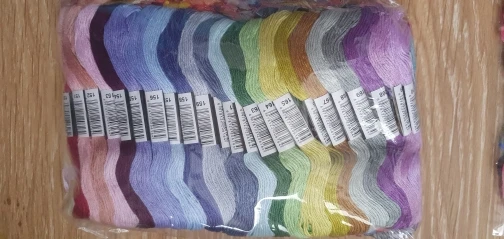 Ниточки хорошие, мягкая синтетика. Всё точно по номерам. В подарок 12 маленьких моточков чуть меньше 4м. Иногда в мотке узлы попадаются, и прилипшие этикетки. Будьте внимательны, одни и те же номера у разных продавцов немного отличаются, значит и с DMC не 100% совпадение. Для меня это не критично, приятная цена, много цветов, я довольна! Доставили службой DPD домой