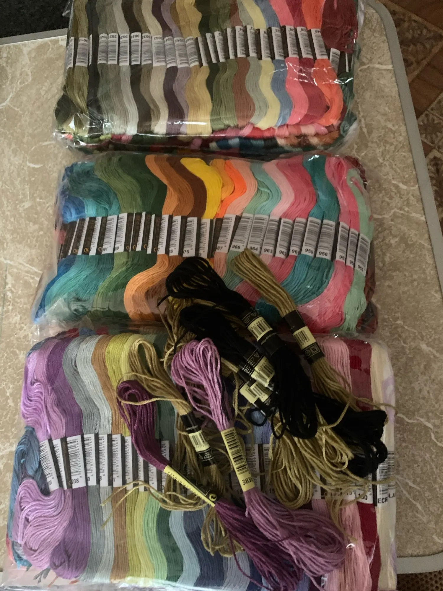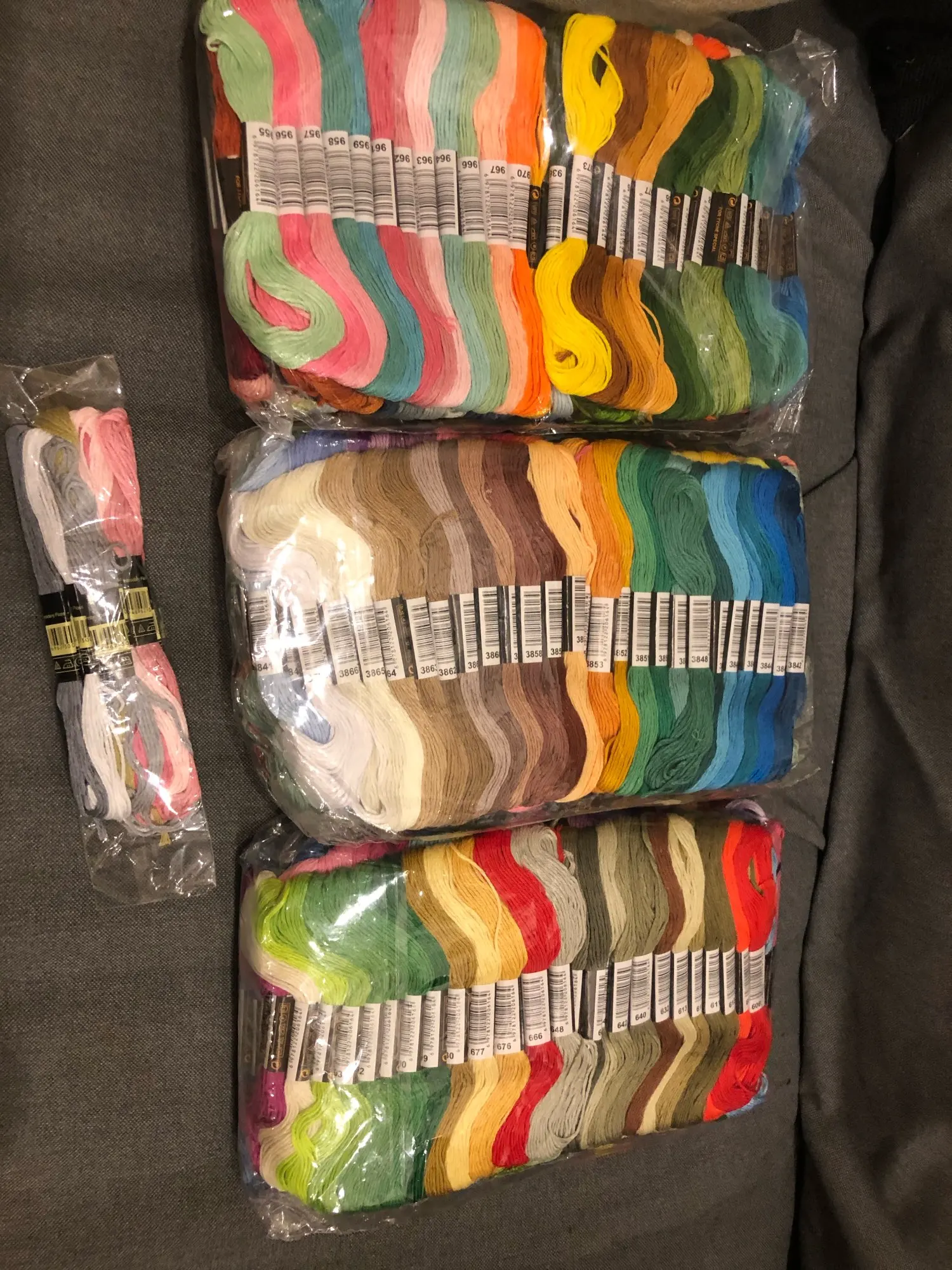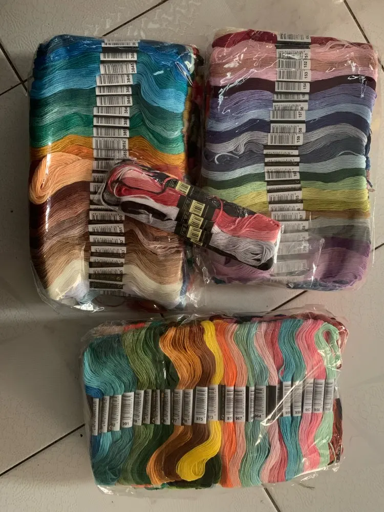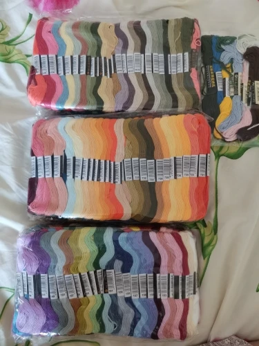 Покупкой довольны! Доставка на дом курьером через месяц. Все 447 шт в наборе. По 149шт пакет. Плюс продавец 8 шт положил в подарок. Очень приятно! На ощупь как хлопок с акрилом, ну или хлопок с обработкой. Не такие, как были в наборах для вышивки с нанесенкой. По наличию цветов пока не проверяли. В мотуе 8 метров. Продавца рекомендую!