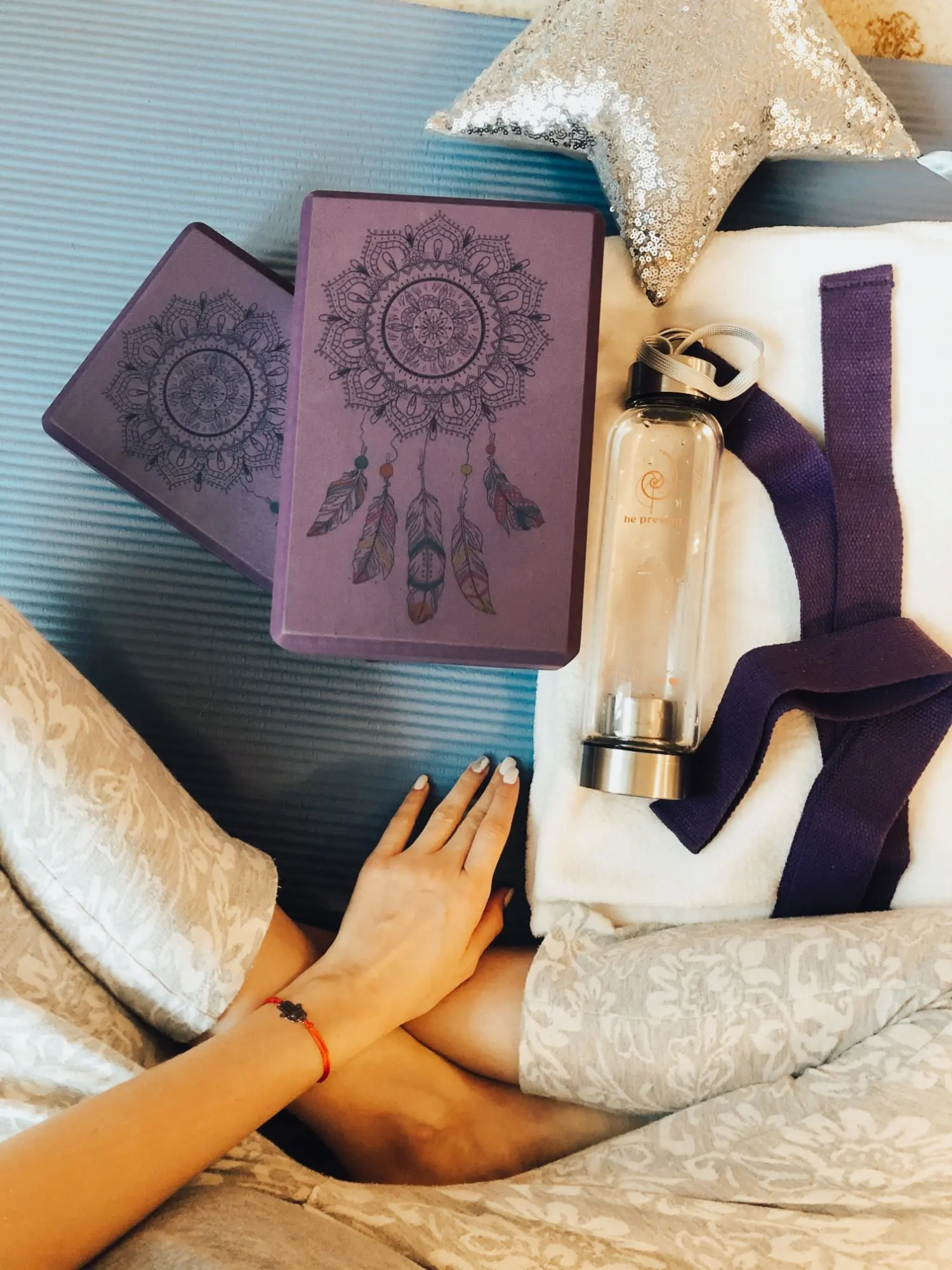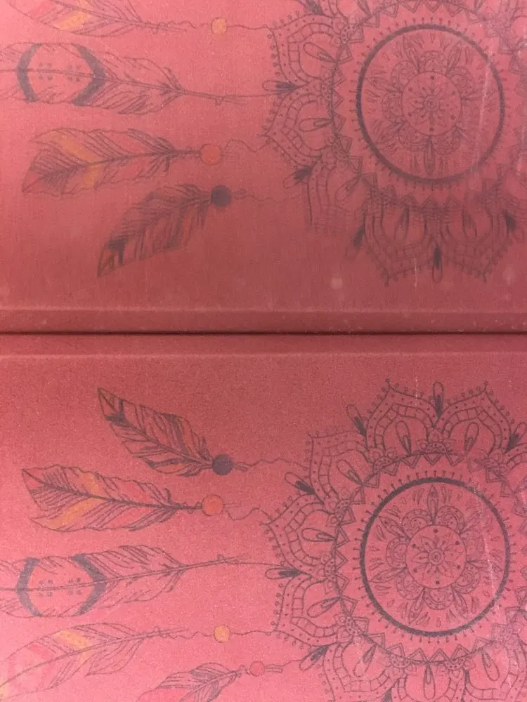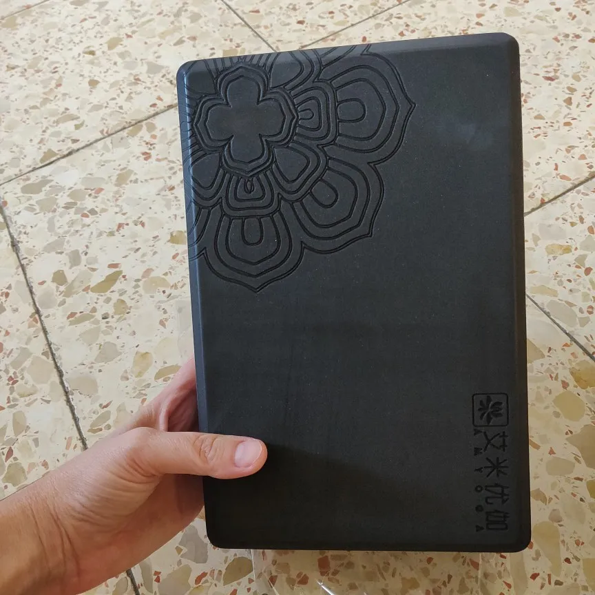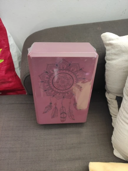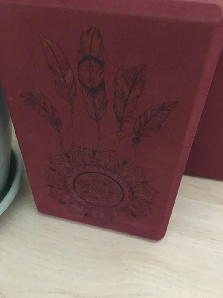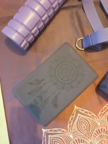 Блок для йоги украшен мандалой-цветком, вырезанным в пену вместо рисунка Ловец снов, который еще красивее